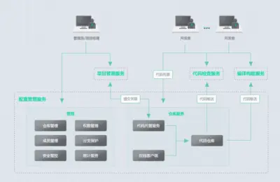 前面已经说过,华为软件开发云(DevCloud)中的配置管理服务全面支持Git,并对Git进行了全面优化。而实际上,这个配置管理服务就是面向软件开发者提供的基于Git的在线代码托管服务。对于管理员和项目经理,它提供了仓库管理、权限管理、成员管理、分支保护、安全管控及统计服务,对于开发者,它则提供了代码托管、代码仓库、在线客户端等服务。配置管理服务的产品架构图,如下图所示: