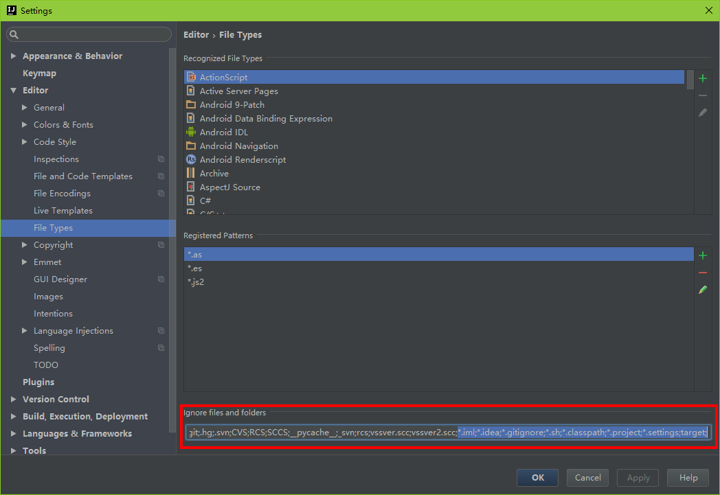 Settings→Editor→File Types- 在下方的忽略文件和目录(