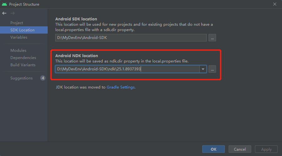 下图为配置Android NDK location的界面: