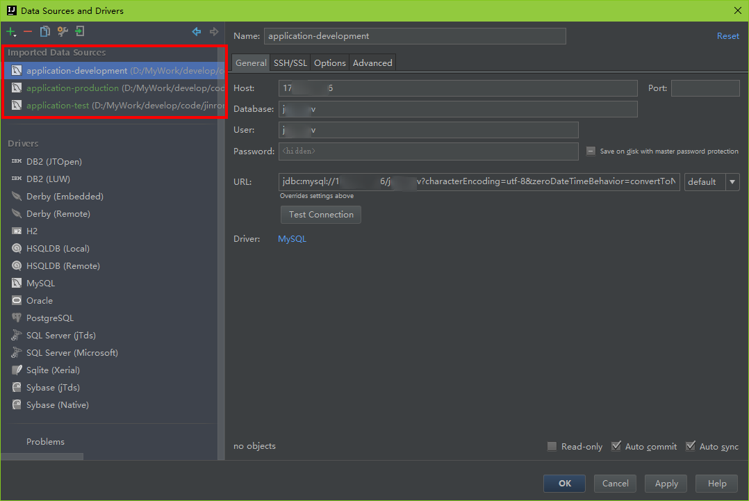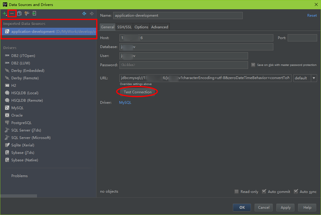 可以点击左上角的“-”删除不需要的数据库配置,只保留需要使用的;可以点击Test Connection连接进行测试连接是否正常,测试成功后点击OK按钮