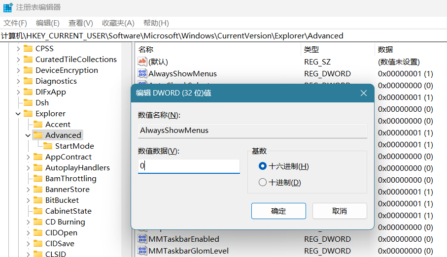计算机\HKEY_CURRENT_USER\Software\Microsoft\Windows\CurrentVersion\Explorer\Advanced