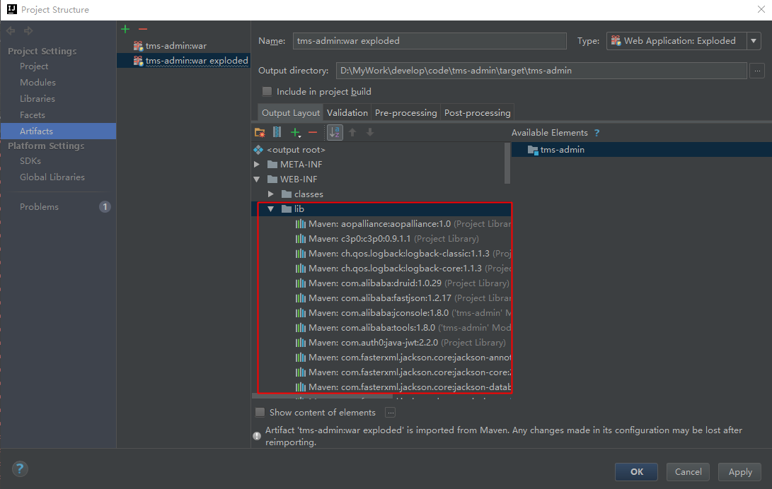解决方法:File > Project Structure > Artifacts > 在右侧Output Layout右击项目名,选择Put into Output Root。如下图所示: