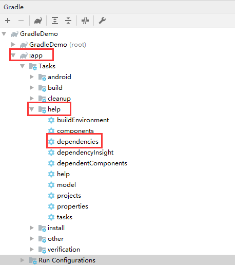 除了命令行,还可以使用Android Studio中的右侧的Gradle面板,找到app模块,展开后找到help目录中的dependencies,如下图所示。