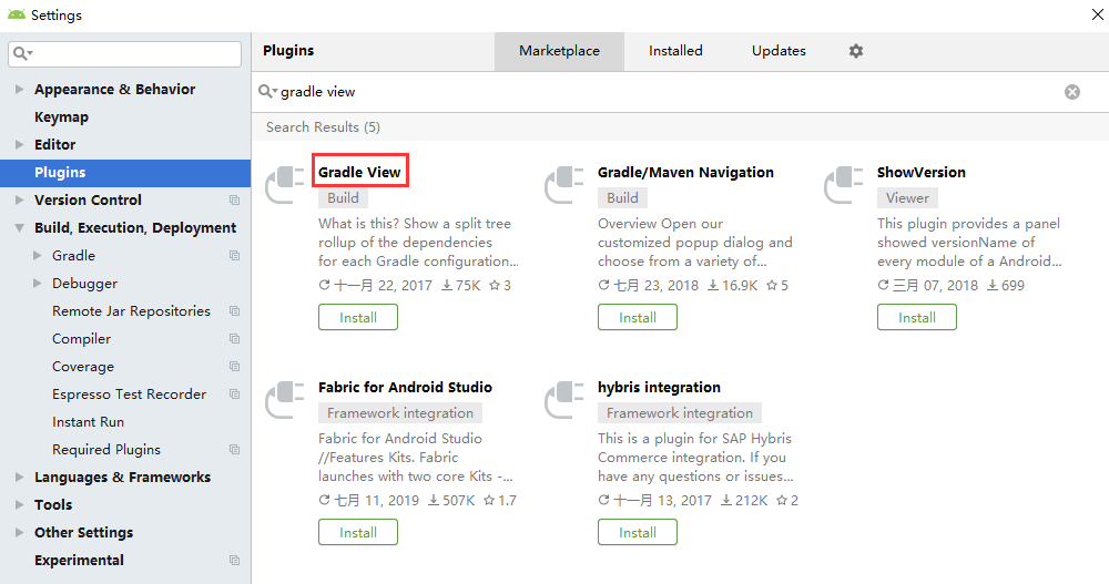 在AS中选择File–>Settings–>Plugins中搜索gradle view,找到Gradle View插件安装并重启AS,如下图所示。
