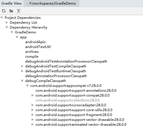 上面是appcompat-v7:28.0.0库的依赖树的一小部分,appcompat-v7:28.0.0依赖了注释1处和注释2的库,注释2处的库又依赖了com.android.support:support-annotations:28.0.0和com.android.support:collections:28.0.0,因此当我们引入appcompat-v7:28.0.0时,会自动下载所有它依赖传递的库。注释3处说明,Gradle在依赖传递时,会自动提升依赖传递的库的版本,默认使用最高版本的库。